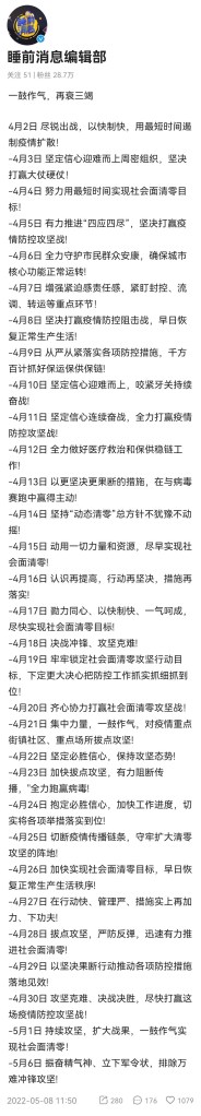 第四,“战争”通常可以鼓动“不利己”、“不惜一切代价”的高尚情怀。事实上,“不惜一切代价”这一短语已经进入了官方防疫的话语体系中。“战争”意味着全面动员,意味着全社会的资源都倾其所有、毫不犹豫地集中在这一件事上,也意味着个人的“牺牲”被视为理所应当。无论是哪种防疫方式,其最终目的本应该是社会的福祉、对高危人群的保护,但现实是,许多案例中个体因为防疫政策本身而死亡,其中不乏本该被保护的高危人群。Liu等人在《Excess mortality in Wuhan city and other parts of China during the three months of the covid-19 outbreak: findings from nationwide mortality registries》研究2020年初武汉3个月的额外死亡,也指出在封城期间心脏病、糖尿病及自杀死亡人数均较往年大幅度上升。[4] 本来,这些额外死亡应当作为事实论据得到承认,但在战争话语体系中,这些死亡均被视为达到“最终胜利”必要的代价而被忽略;而这种“最终胜利”,因为病毒本身的特性以及战争话语体系的僵化,实际上已经遥遥无期。这反过来,使对个人利益“暂时”的损害时限拉长到了无限。而鼓吹“战争”中“无私高尚”的另一面,则是对任何软弱、利己的不宽容,官方媒体经常报道国外公民“集会游行反对封控”的新闻,意在批判国外公民的“愚蠢”、“不顾大局”、“自私自利”,这一切均与战争体系下的“高尚情怀”相反,从道德上打压个体为自己争取出行生活权利的行为,其本身也是对国内民众更好的控制手段。而封控区人民一有抱怨,则遭到网民攻击,而官方则纵容这种攻击,也是同样的思维方式。